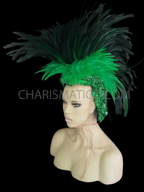Appliquã© Accented Cap-Style Diva's Two Toned Green Feather Mohawk Headdress