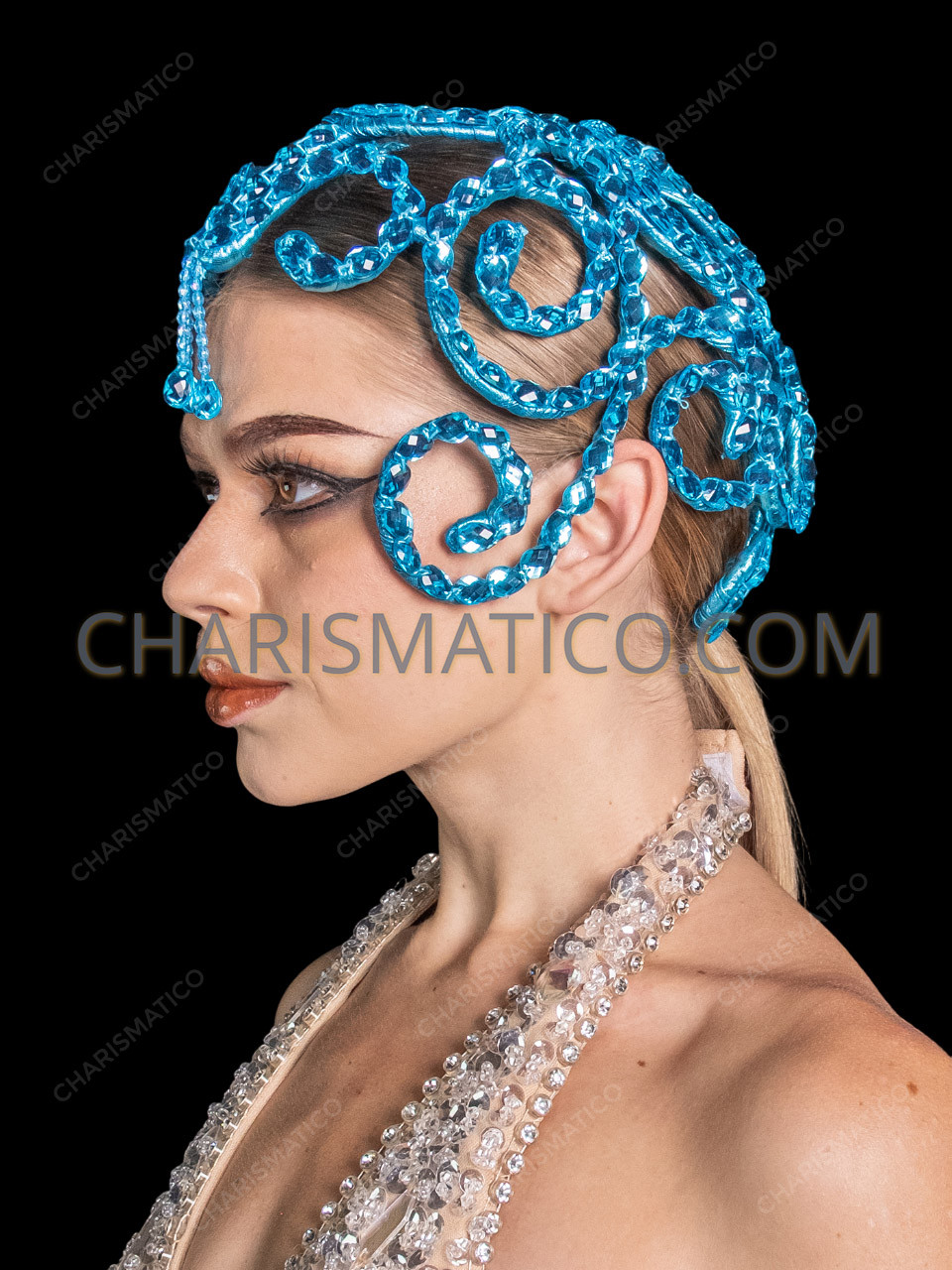 Shine with futuristic elegance in this Aqua Blue Crystal Beaded Swirl Cage Headpiece Cap, designed to add a bold yet lightweight accent to any stage look. Handcrafted with shimmering aqua blue beads arranged in intricate swirling patterns, this headpiece fits snugly like a cap, offering both comfort and security during high-energy performances. Its unique cage design creates a striking silhouette that catches the light from every angle, making it perfect for drag queens, showgirls, cabaret performers, or festival dancers. A dazzling alternative to traditional feather headdresses, this beaded headpiece delivers drama, sparkle, and sophistication in one unforgettable piece.