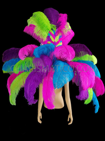 The ever popular clean curves of the Art Deco period are presented here in silver glitter with crystal highlights. The neon green feathers on this headdress and matching collar backpack would pair with great delight with both a pageant gown or a showgirl's outfit.