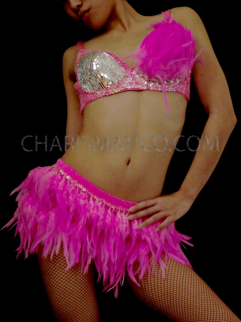 Two pieces of HOT pink and silver goodness. Call it a burlesque dress, or bra and hot pants, either way the feathered bottoms have you covered yet show lots of leg. The top is asymmetrical with one side sleek and the other fluffy.