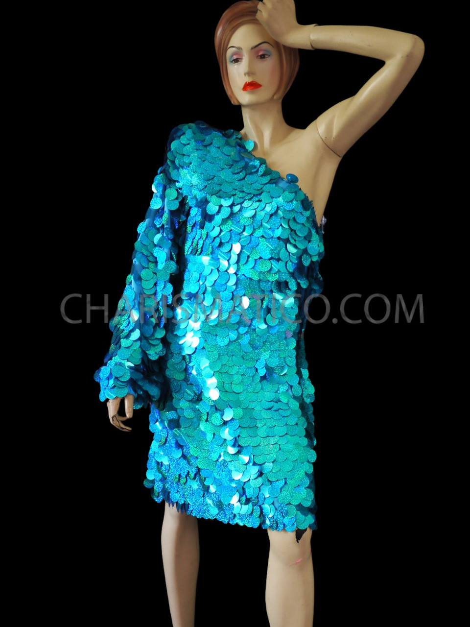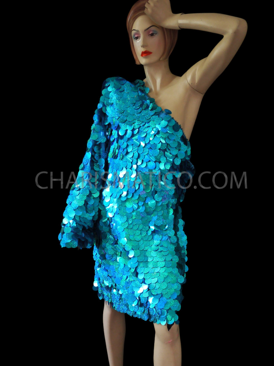 Asymmetrical, Iridescent Aqua Blue, Jumbo Sequin Diva Drag Queen Mini-Dress