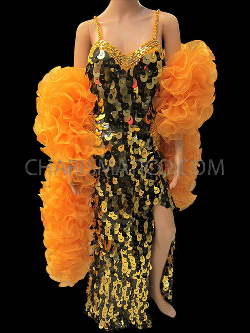 Black And Gold Jumbo Sequin Pageant Gown With Marigold Boa