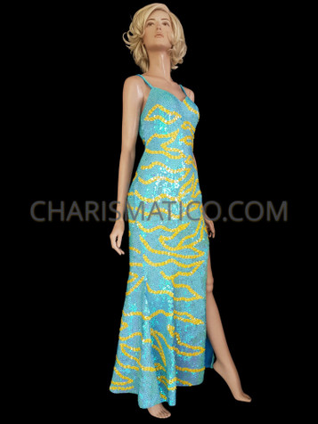 This mostly white sequin pageant gown has black zebra stripes that add visual interest. The thin straps hold it up while giving a nearly corset like illusion. A unique and lovely choice.