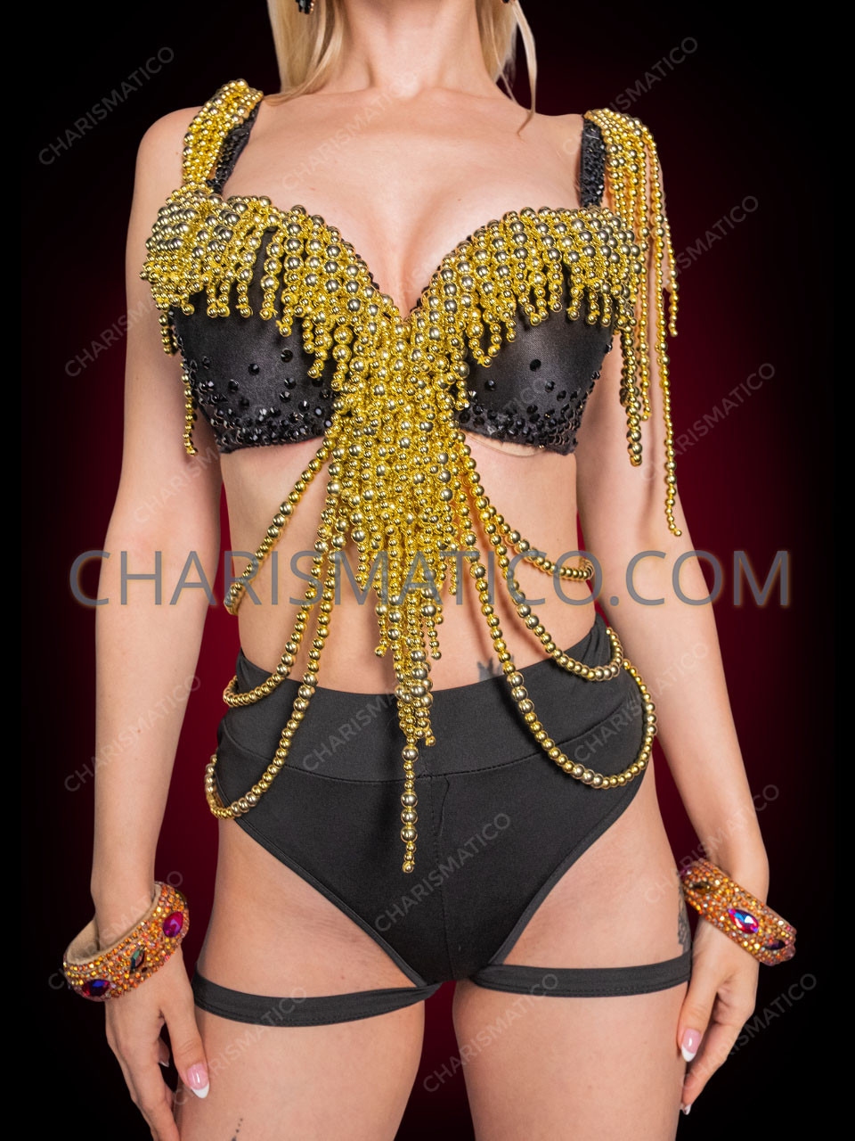 • A gold beaded fringe bra that is perfect for showgirls, burlesque, or belly dancing.