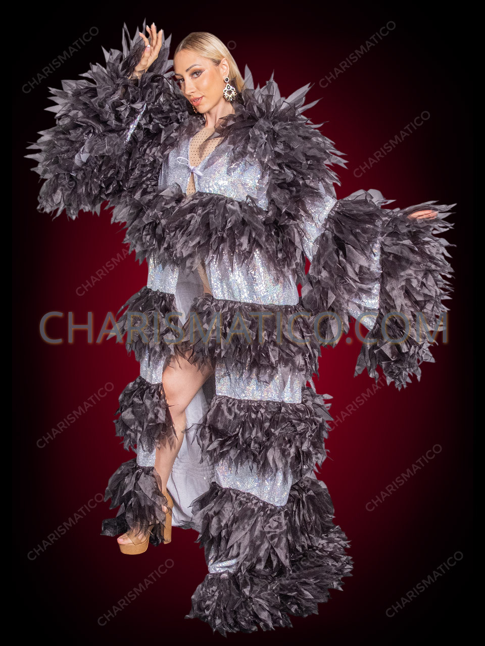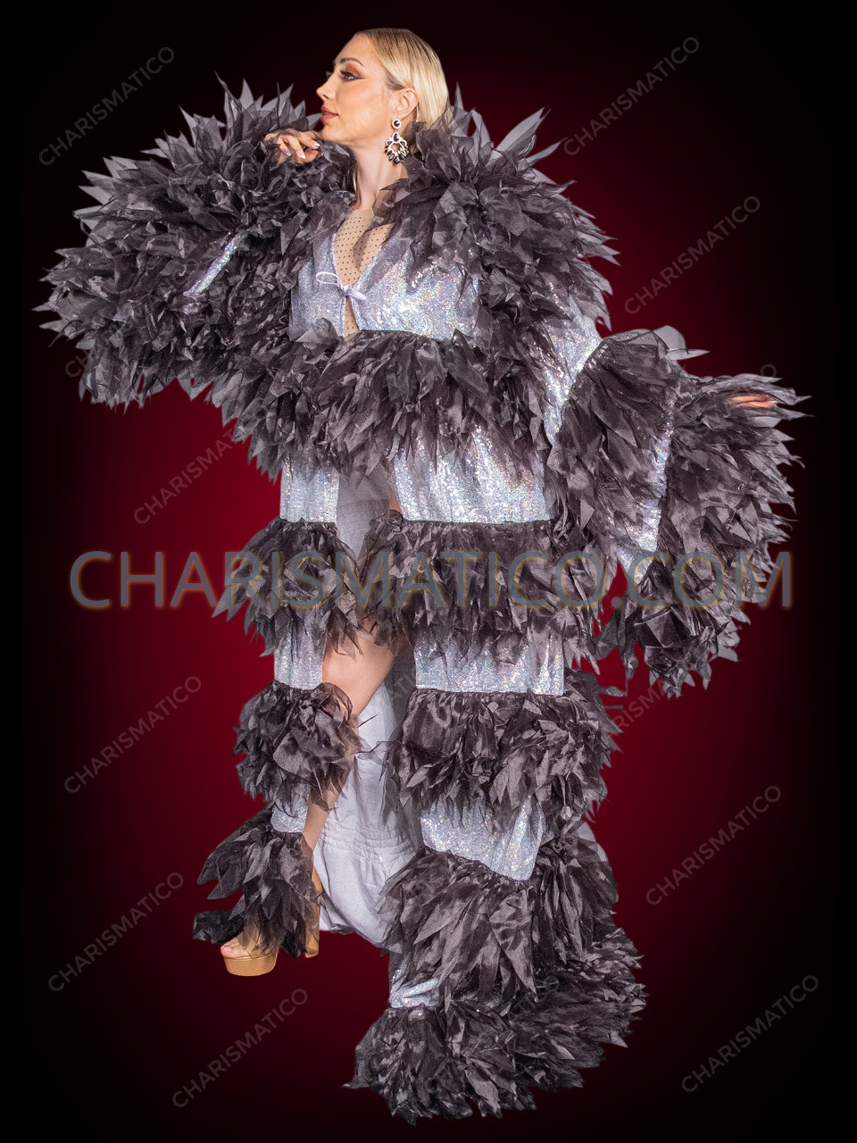Command the spotlight in the Black Silver Organza Drag Dramatic Fluff Coat, a fearless statement piece designed for queens who live for maximum impact. Crafted from sheer black organza meticulously cut into leaf-shaped panels, this coat creates explosive texture and movement with every strut and spin. Cascading bands of shimmering silver sequin fabric slice through the silhouette, catching the light and amplifying your presence on stage. Voluminous, theatrical, and unapologetically bold, this coat delivers high-drama fantasy—perfect for reveals, finales, and entrances that demand gasps. This is not outerwear; it’s drag armor for icons only.