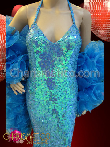 This is a very classy and very sexy dress for those evening dance parties and it is extremely attractive. It is an off shoulder long gown in beautiful blue sequined fabric. The front is embroidered with a beautiful silver beaded floral patter that extends from the top left shoulder down into a high cut slat lined with a extravagant ruffle boa that wraps around the hem and flows back up to the left should in a loose arm train.  This dress is definitely unique and sure to draw everyone's attention to your style.