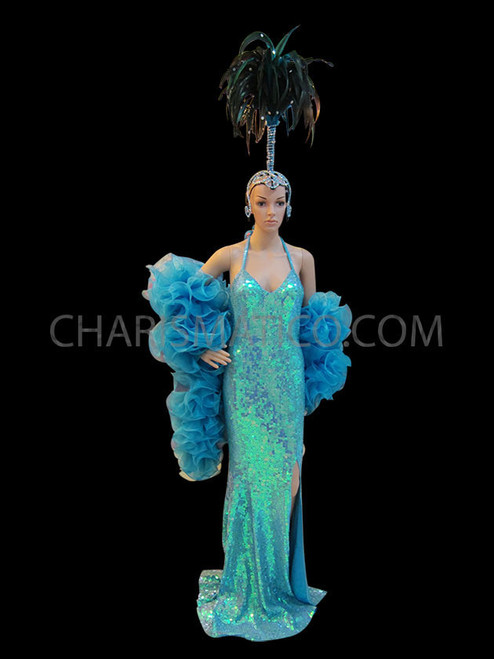 Blue Sequin Pageant Gown, Organza Ruffled Boa, And Matching Headdress