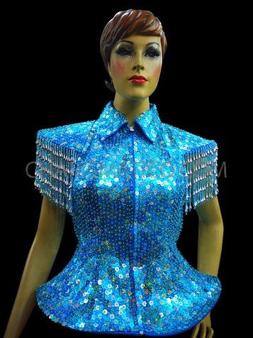 Mother Monster sure knows how to pick the exciting dance pieces.  Take this Diva Jacket, for example.  Covered in Iridescent shades of blue sequins, this edgy piece will round our your costumes no matter what you use it for.