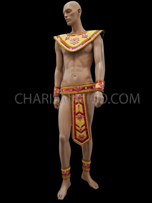 A simple costume can also be converted into something graceful and stylish with the help of accessories from Charismatico Dance wear. This golden color shoulder guard with red border and long front guard with belt for the waist, is one of the statement pieces to own.