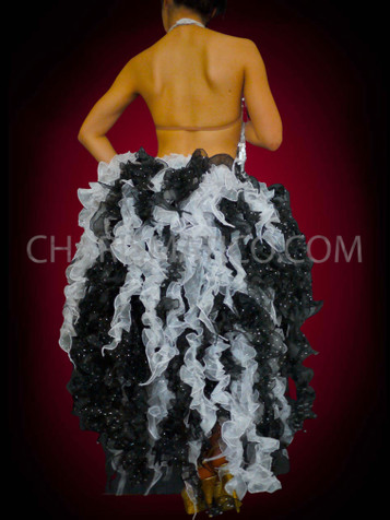 A classic burlesque style, featuring a leotard like striped front with appliques on the hips adorned with a matching striped lace tail or buttock skirt. Sequins provide the flash and glitter on the upper part and accent beaded fringes on the skirt.