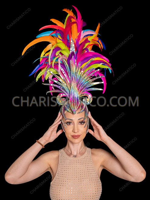 The Carnival Spectrum Rainbow Pride Feather Headdress is a vibrant celebration of color, movement, and unapologetic self-expression. Designed with a striking rainbow gradient, this statement headdress features layers of bold, flowing feathers paired with shimmering crystal and mirror accents that catch the light from every angle. Sculpted to rise dramatically above the head, it delivers instant stage presence while remaining balanced and comfortable to wear. Perfect for Pride events, carnival performances, drag shows, festivals, and high-energy productions, this headdress embodies joy, diversity, and fearless glamour—making it the ultimate showpiece for performers who want to stand out and shine.