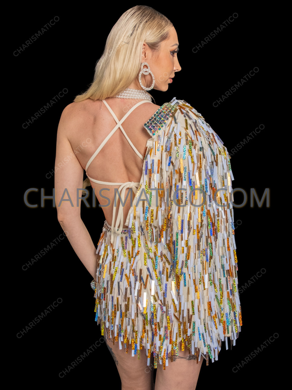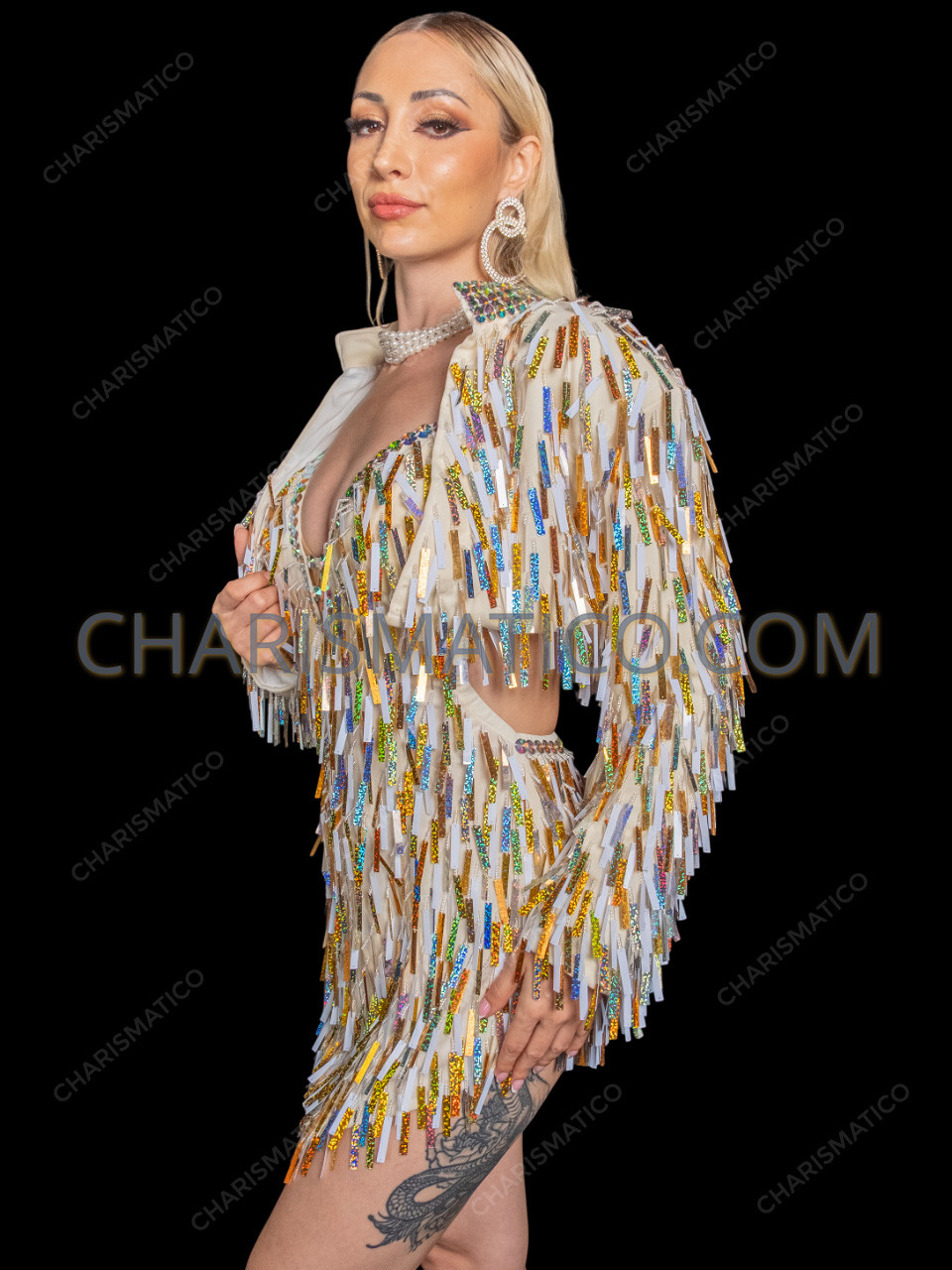 Own the spotlight in our Champagne Gold Sparkle Rectangular Sequin Dress with Matching Jacket, a show-stopping ensemble designed for maximum glamour and dramatic stage impact. The mini dress is fully embellished with cascading rectangular sequins in shimmering champagne, gold, silver, and white tones, creating bold texture and multidimensional sparkle with every movement. The curve-enhancing silhouette is paired with a coordinating long-sleeve jacket, equally adorned with dazzling sequins for added drama and versatility. This set is the perfect choice for a reveal show — make a grand entrance in the glamorous embellished jacket, then remove it mid-performance to unveil the sparkling mini dress underneath for a stunning transformation moment. Designed for showgirls, drag performers, cabaret acts, and high-glam productions, this dynamic two-piece look delivers impact, flexibility, and unforgettable shine from start to finish.