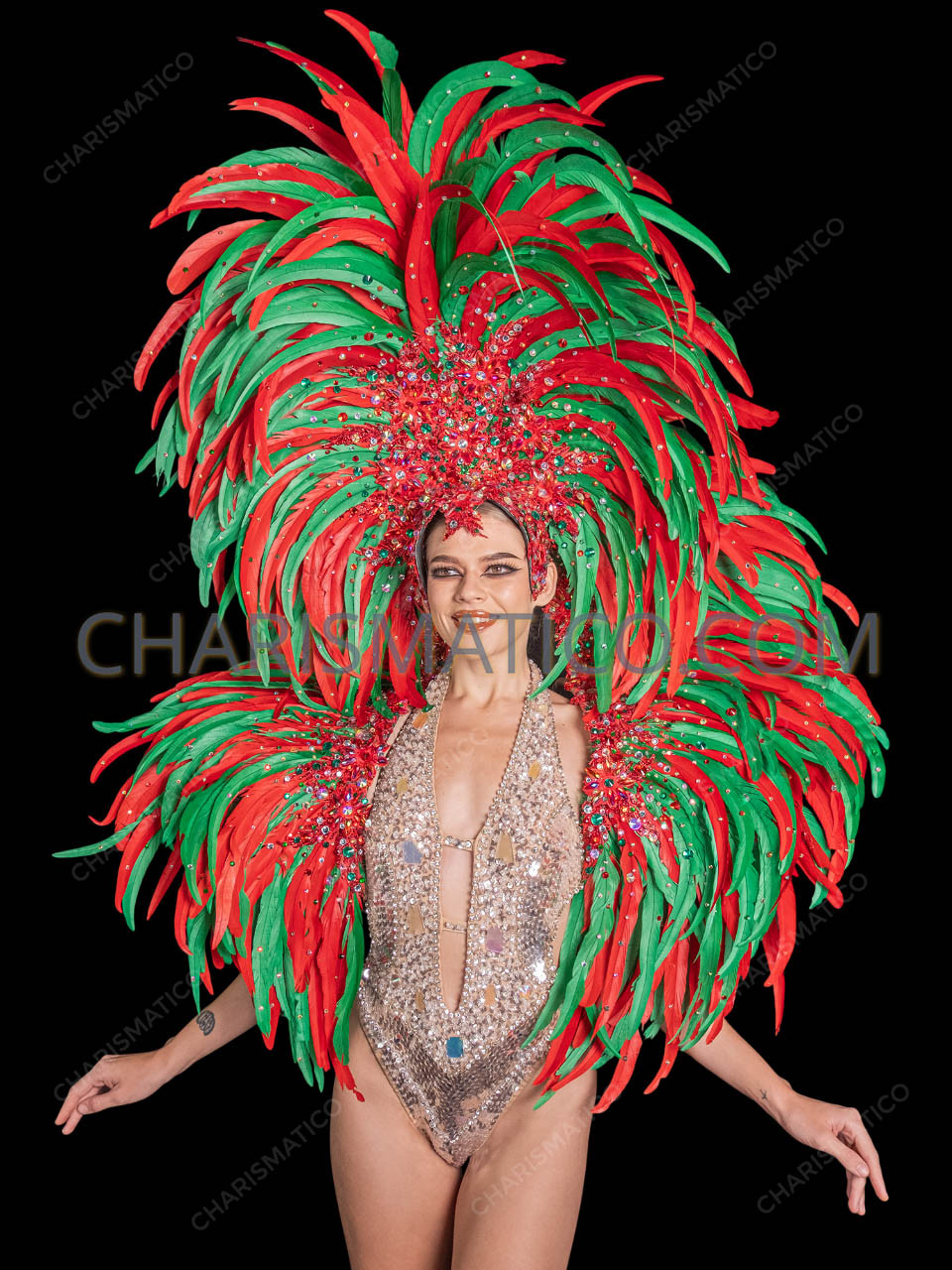 Step into the spotlight this holiday season with the Christmas Feather Carnival Drag Queen Showgirl Headdress Backpack Set. Bursting with vibrant red and green feathers, this dazzling two-piece ensemble includes an oversized feather headdress and a matching feather backpack, both embellished with sparkling crystals for maximum brilliance under the lights. Designed to capture the festive spirit of Christmas, this show-stopping set is lightweight yet dramatic, making it perfect for parades, stage performances, drag shows, and holiday-themed events. With its bold color palette and glittering details, this costume guarantees you’ll command attention as the star of any celebration