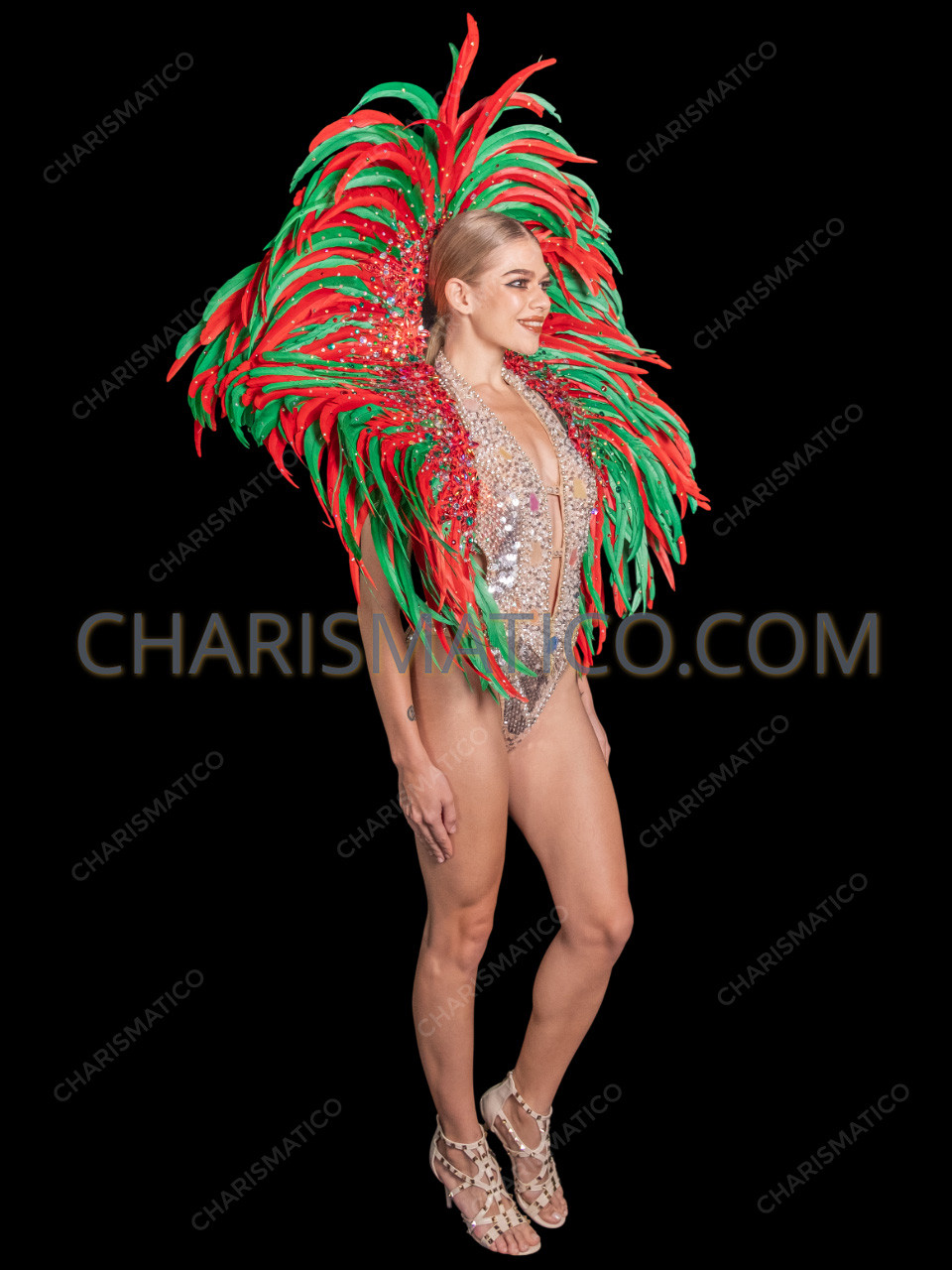 Step into the spotlight this holiday season with the Christmas Feather Carnival Drag Queen Showgirl Headdress Backpack Set. Bursting with vibrant red and green feathers, this dazzling two-piece ensemble includes an oversized feather headdress and a matching feather backpack, both embellished with sparkling crystals for maximum brilliance under the lights. Designed to capture the festive spirit of Christmas, this show-stopping set is lightweight yet dramatic, making it perfect for parades, stage performances, drag shows, and holiday-themed events. With its bold color palette and glittering details, this costume guarantees you’ll command attention as the star of any celebration