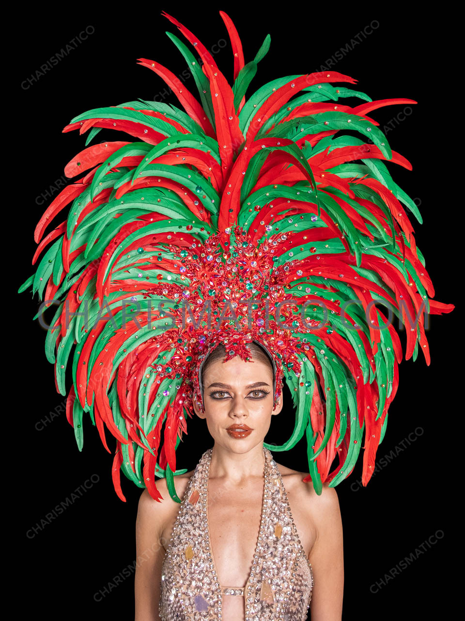 Step into the spotlight this holiday season with the Christmas Feather Carnival Drag Queen Showgirl Headdress Backpack Set. Bursting with vibrant red and green feathers, this dazzling two-piece ensemble includes an oversized feather headdress and a matching feather backpack, both embellished with sparkling crystals for maximum brilliance under the lights. Designed to capture the festive spirit of Christmas, this show-stopping set is lightweight yet dramatic, making it perfect for parades, stage performances, drag shows, and holiday-themed events. With its bold color palette and glittering details, this costume guarantees you’ll command attention as the star of any celebration