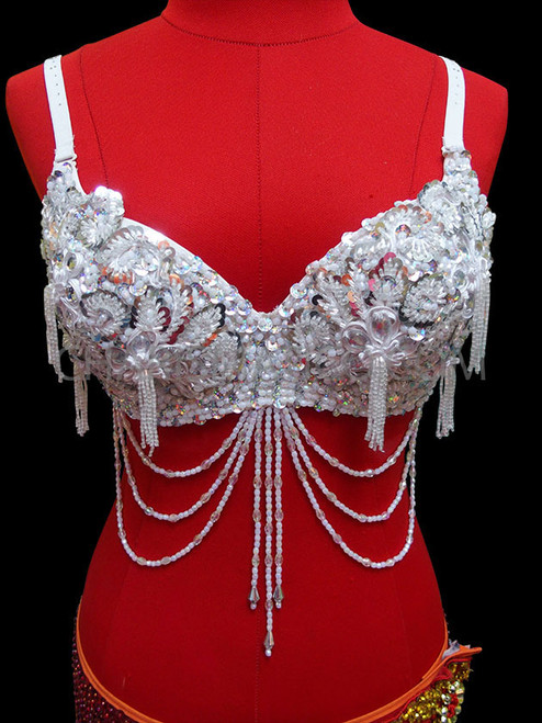 • A stunning customized crystalized bra that is perfect for showgirls, burlesque, or belly dancing.