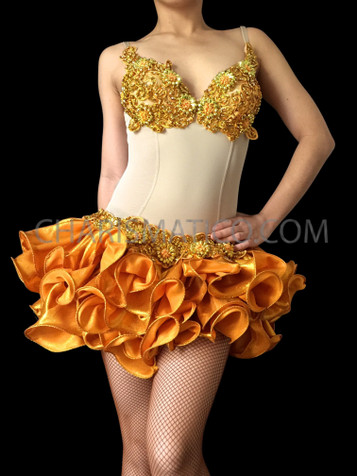 The dare to bare trend hits new heights nearly every year. This little mini dress dares you to bare skin and be the center of attention with satin ruffles and loads of bead work applied to a nude base that preserves modesty for those who desire to avoid costume malfunctions.