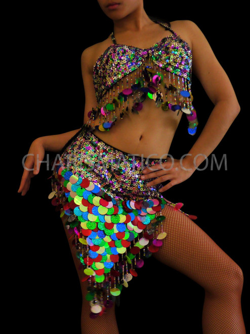 Rainbow sequined bikini top with a double layer of jumbo sequins forming the edging.  This tends to match the skirt perfectly. The skirt features a deep v-hem and sits low on the hips for a very flattering shape.