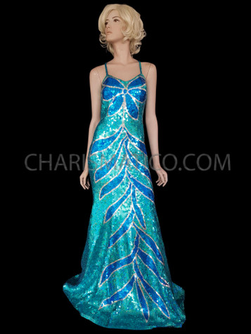 This beautiful pageant gown is the one which will lift you to Queen Position for sure. This long sequined dress is in a silver, dark blue and light blue combination with a deep V-neckline and a deep cut back. This bright and long dance gown serves for giving both attractive and elegant looks.