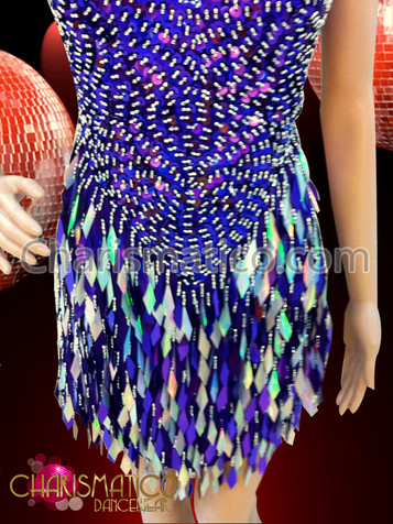 The design of this gorgeous dress is unique and very feminine. The combination of bright blue with silver decorations of sequins makes it very appealing. The jeweler paired with the dress makes the look complete. The shimmering sequins in the dress make it a perfect dance costume.