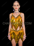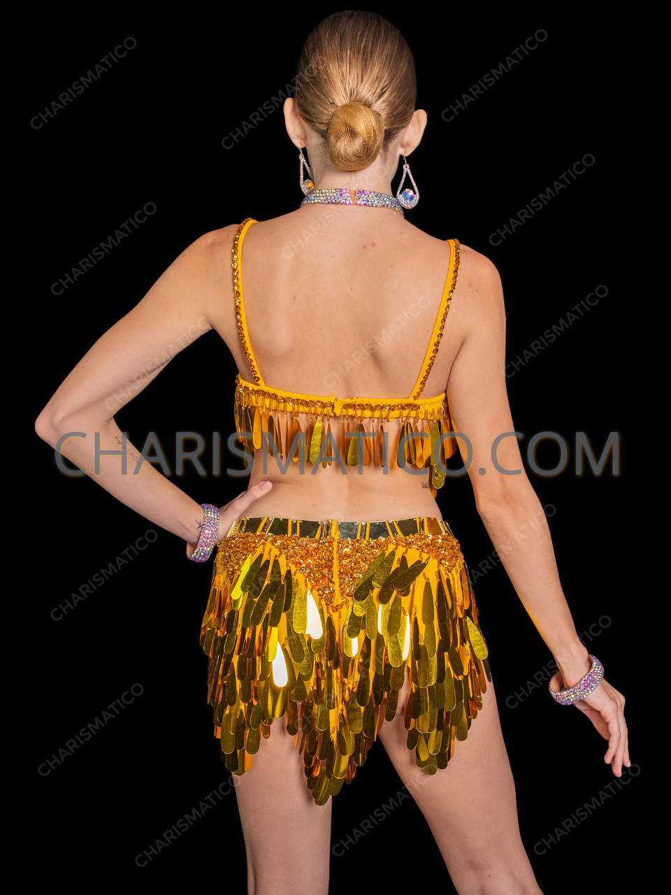 Shine brighter than the spotlight in this Dazzling Gold Teardrop Sequin Dance Two-Piece Dress, a show-stopping ensemble designed for maximum sparkle and movement. The top and skirt are lavishly covered in oversized golden teardrop sequins that catch and reflect light with every step, creating a dramatic shimmering fringe effect. The cropped V-neck top pairs perfectly with the high-waisted skirt, both embellished with glittering accents that enhance the glamorous finish. Ideal for salsa, Latin dance, cabaret, showgirl performances, and carnival stages, this golden two-piece brings fiery energy and undeniable glamour to any performance.