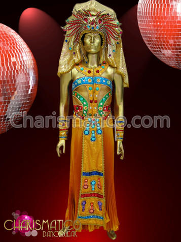 Command the stage with this **Dramatic Black and Gold Egyptian Pharaoh Warrior Headdress**, a breathtaking piece inspired by the majesty of ancient Egypt. Featuring a sculpted Pharaoh head adorned with a cobra snake at the forehead, this headdress embodies the divine power and protection that the uraeus symbol granted to ancient kings and queens. Crafted with a luxurious blend of materials, it combines radiant gold PVC for a striking metallic finish with deep black fabric accents, creating a powerful contrast. The headdress not only captures the allure of Egyptian mythology but also makes a statement of regal authority, ideal for unforgettable performances, photo shoots, or any occasion where you wish to channel the aura of a true warrior-pharaoh.