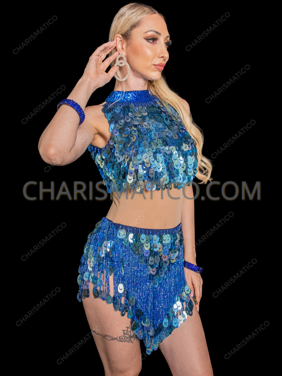 The Electric Blue Illusion Jazz Latin Show Dress is designed to make group dancers shine with powerful stage presence and flawless uniformity. Drenched in vibrant electric blue sequins and swinging bead fringe, this dress delivers eye-catching movement that amplifies every jazz or Latin routine. The strategically placed nude mesh at the waist creates a striking two-piece illusion while maintaining a secure, seamless fit—perfect for synchronized group performances. Sparkling under stage lights and crafted for dynamic motion, this show dress ensures your entire dance group looks polished, confident, and unforgettable from every angle.