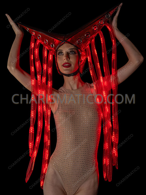 Command attention from galaxies near and far with the Electric Red LED Horn Headdress with Flowing Light Strands. Crafted from sleek, high-shine red vinyl, this avant-garde headpiece features two bold, upward-curving horns and cascading strands illuminated by vibrant LED lights. Each glowing tendril moves with your every step, creating a dazzling kinetic display of light and motion. Whether you're commanding the stage as an alien empress or electrifying the runway in a futuristic fantasy, this headdress is built for maximum impact. Lightweight yet dramatic, it's the ultimate showpiece for drag performers, dancers, and cosmic fashion rebels.