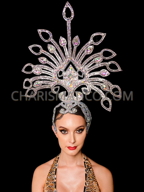 Indulge in the allure of extravagant theatrics with this chic headdress. Crafted from premium glitter cardboard, its lustrous surface exudes a sense of opulence, setting the stage for an unforgettable style experience. What sets this headdress apart is the burst of creativity displayed through the intricate mirror leaf shapes that emerge from its base. These captivating leaves, meticulously cut and artfully arranged, create a visually striking effect that radiates drama and flair. Make an entrance like no other, leaving a lasting impression wherever you go.