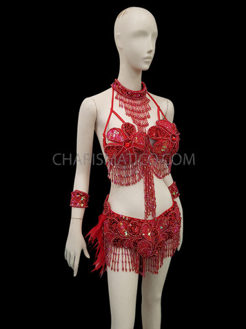 • A customized beaded and rhinestone decorated bra and skirt set with matching choker necklace and bracelets that is perfect for showgirls, cabaret and burlesque, or Carnival.