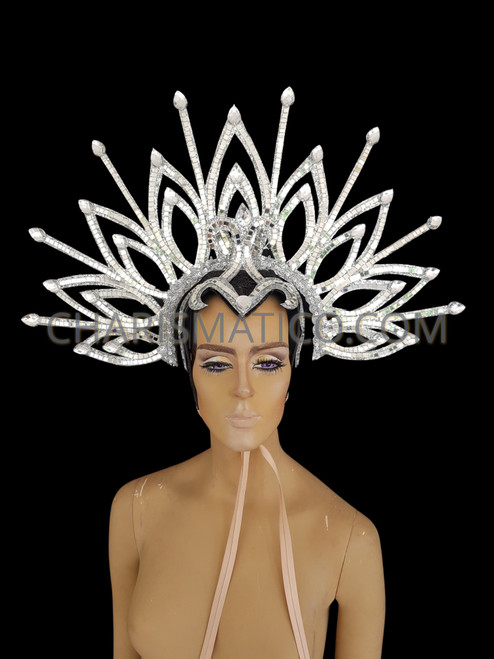 Exotic Diva Showgirl Silver Color Head Dress In Leafy Patterns