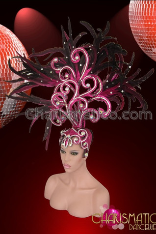 • Hot, exotic color that command the attention of all who see it. That is fuchsia. Add this color to silver and watch the pulse quicken with delight. This Swirled headdress has both fuchsia feathers and gemstones to delight the audience.