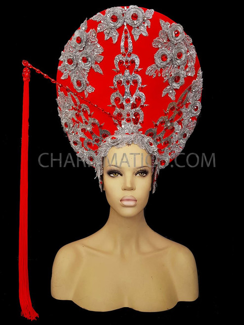 Exotic Large Silver Lace Embellished Red Circular Drag Queen Headdress