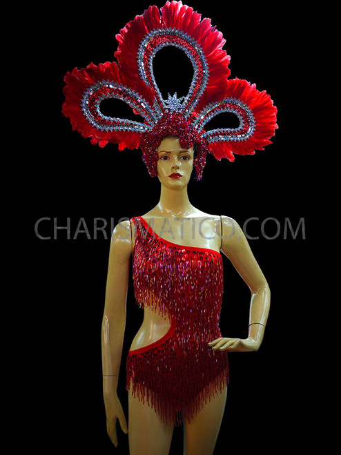 • "Teasing cutouts show your toned sides in this fantastic Iridescent Asymmetrical Red Beaded Fringe and Sequin Adorned Leotard.  Paired with it in this set is a matching feathered triple looped headdress. It's simply as stunning as you are. "