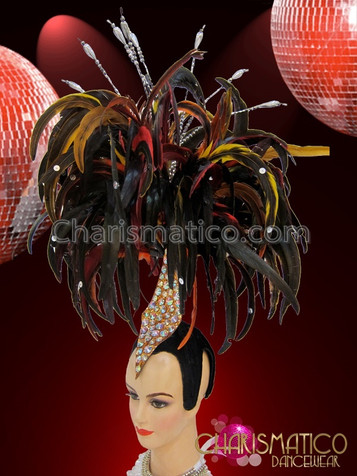 This exotic option is neon orange under metallic gold. The base is a simple style that fits with a lot of futuristic looks. The heat continues with a tall mass of feathers and a spray of crystals on a gold base. Perfect for the carnival.