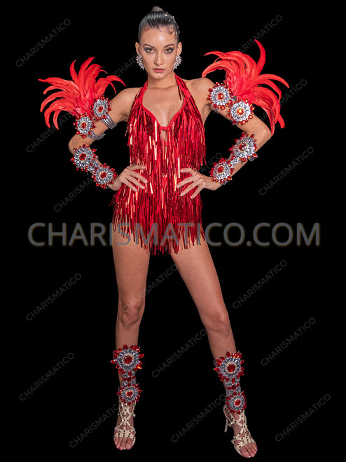 Ignite the stage with the Fiery Red Metallic Sequin Samba Carnival Costume Set, designed to captivate and move with every step. The show-stopping leotard is crafted from vibrant rectangular sequins, creating a stunning fringe effect as you dance, catching the light and dazzling your audience with every twist and turn. The set includes feathered arm cuffs, matching bracelets, and leg cuffs, each adorned with bold, metallic accents to complement the fiery red theme. Whether you're performing at carnival, samba, or a high-energy dance event, this costume will ensure you stand out with its dynamic movement and glamorous, head-turning style. Perfect for dancers who want to shine in the spotlight!