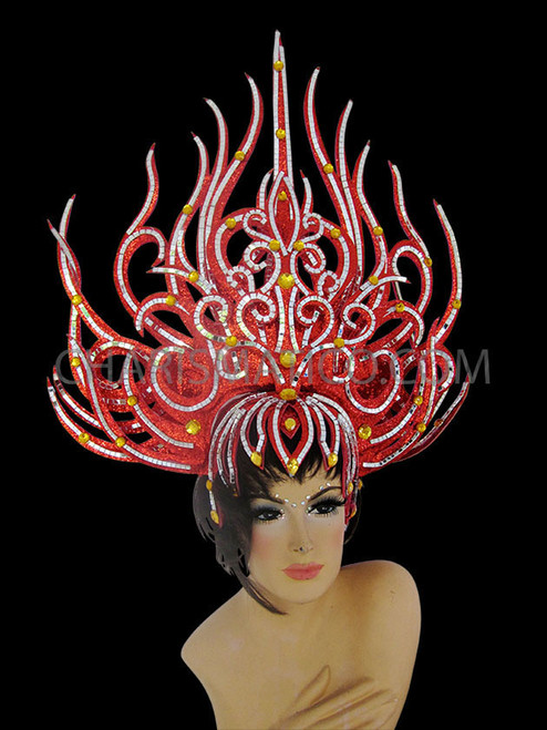 A flaming hot red glitter headdress steps out of the crowd with the addition of silver mirror tile accents. There are tons if versions of this classic style which mix and match with feathered collars, backpack wings, and additional pieces with ease.