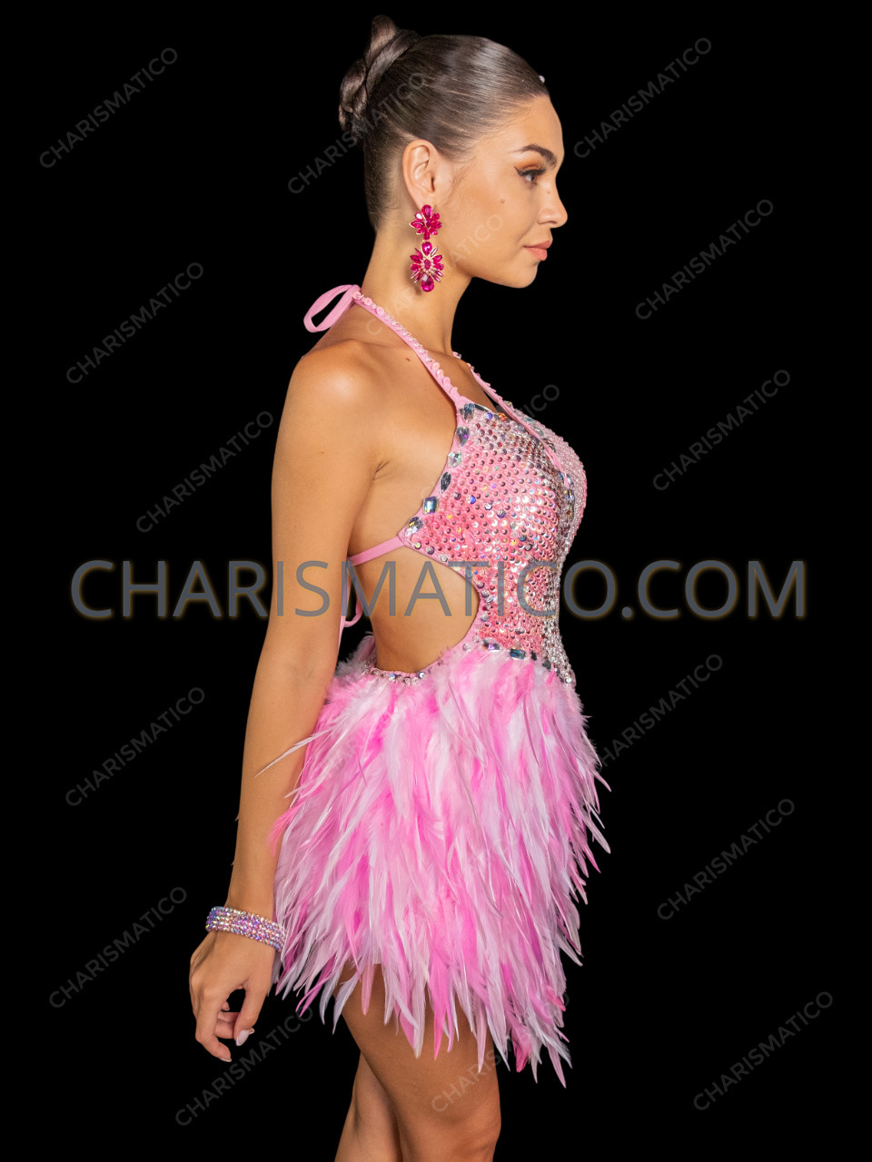 Step into the spotlight with our Flamingo-Inspired Pink Feather Showgirl Dress, a captivating blend of elegance, sparkle, and playful glamour. This handcrafted costume features a dazzling sequin and crystal-embellished bodice, designed to catch every ray of light as you move. The skirt is adorned with layers of soft pink feathers, creating beautiful motion and volume that channel the graceful charm of a flamingo. Perfect for Latin dance, cabaret, showgirl, or stage performances, this dress combines a figure-flattering silhouette with luxurious craftsmanship. With its halter neckline and adjustable ties, it ensures both comfort and flexibility while delivering a truly show-stopping appearance for every performance.
