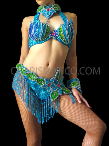 • A customized beaded and rhinestone decorated bra and skirt set with matching choker necklace and bracelets that is perfect for showgirls, cabaret and burlesque, or Carnival.