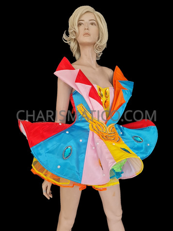This is a colorful and futuristic Dollie dress. The dress features great attention to detail from the rainbow of satin ribbon to the delicate lace covered fabric. One thing is for sure: this dress makes everyone wearing it look fantastic.