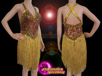 If you have it, flaunt it in this delightful fuchsia salsa dance dress.  The top has a lot of dramatic details like sequin, bead, and crystal accented lace and deep daring cutouts. The skirt features sequin fringe to make any dance really pop.