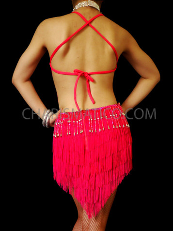 This is every bit of a stunning and elegant dress for all kind of dance purpose. The dress is a combination of black and hot fuchsia shades with black polka stone dots covering all over the bust. The lower skirt section is a short fringe that extends up to the knees.
