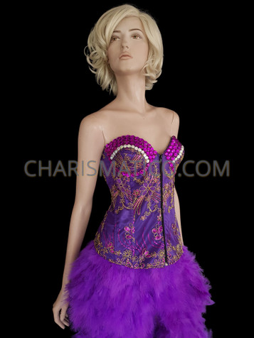 Fuchsia Sequined Corset, Matching Blue Feathered Skirt And Purple Collar