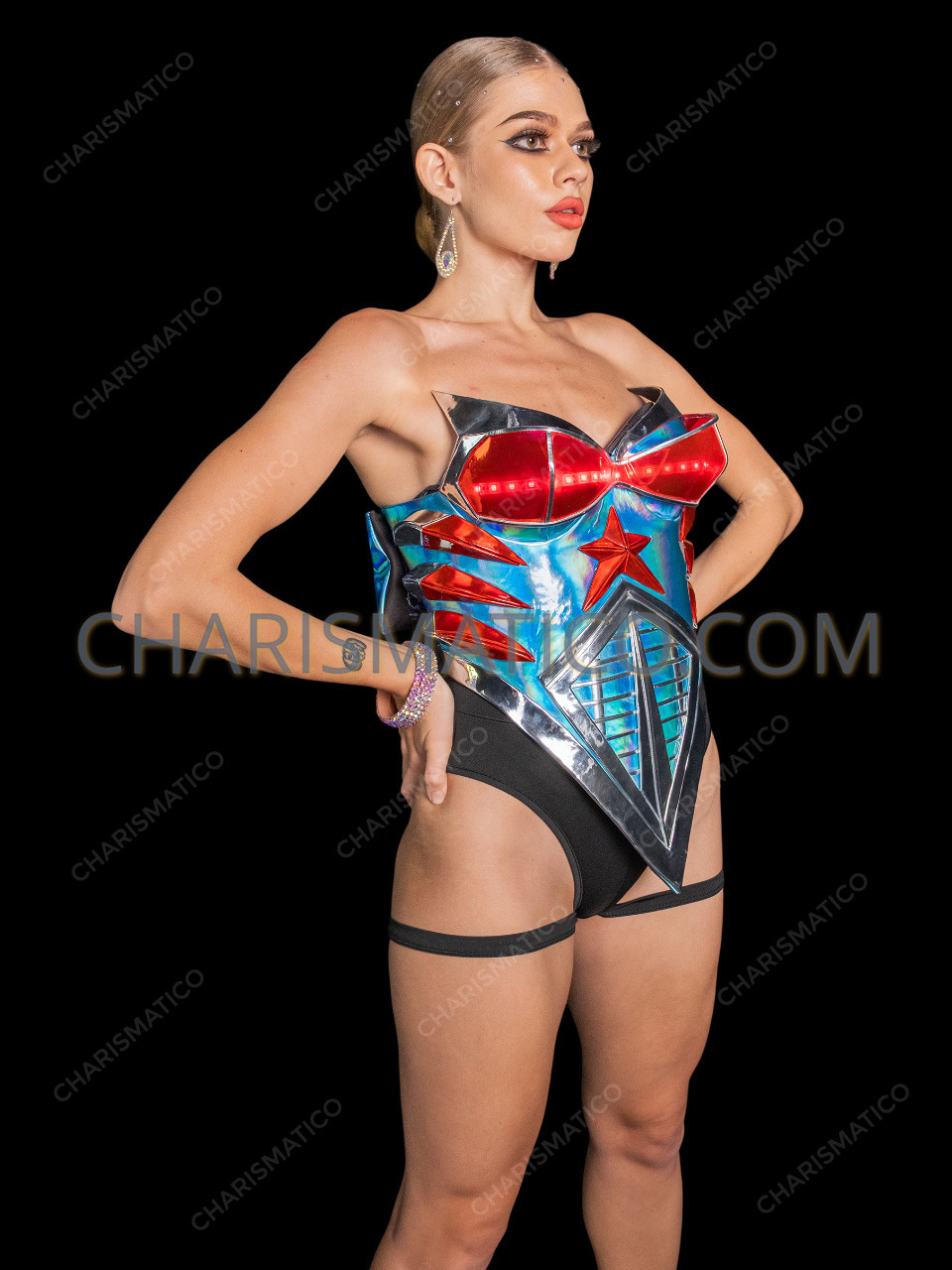 Command the stage with our Futuristic Mugler-Inspired Motorcycle LED Light Bustier Corset, a bold tribute to the visionary designs of Thierry Mugler. This striking piece combines high-fashion artistry with edgy performance wear, featuring a sculpted motorcycle-inspired silhouette in reflective holographic panels accented with vibrant red detailing. The dramatic bustline is illuminated with integrated LED lights, adding a captivating glow that demands attention under stage lighting. A statement red star centerpiece and aerodynamic paneling evoke Mugler’s iconic avant-garde style, while the lace-up back ensures a secure, adjustable fit. Perfect for concerts, drag shows, cosplay, and high-impact performances, this corset transforms you into a living piece of wearable art.