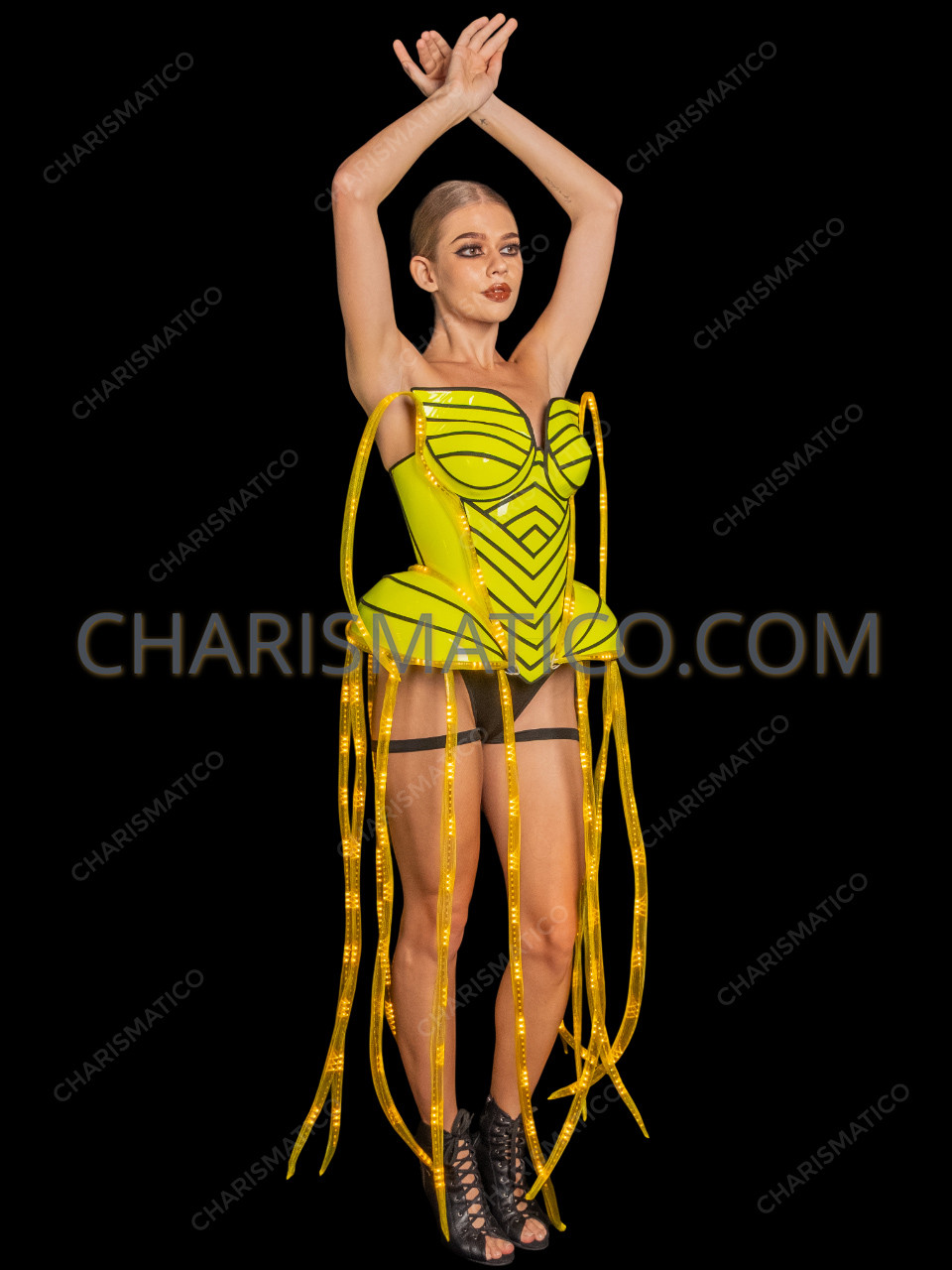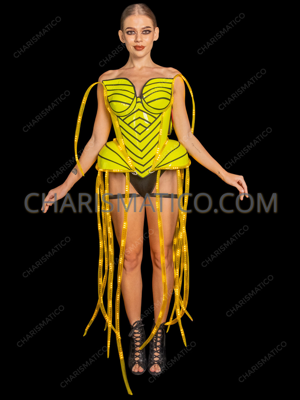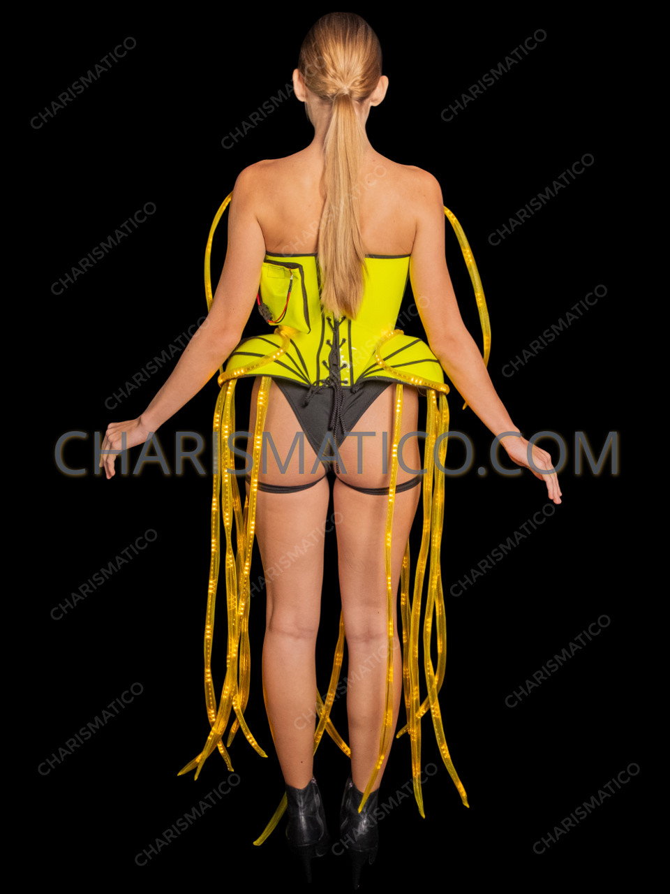 • A made to measure neon yellow LED corset that is perfect for concerts, nightclubs, parades, festivals, and themed events