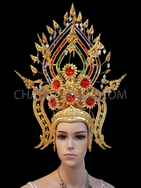 An exquisite looking gold sequinned headdress, designed in a Thai stylized theme. A silver and gold sequinned helm, with a ruby crystal forms the center of the forehead, followed by a clustered crown of gold sequinned flowers with large ruby crystals. The final top has red, blue and green, gold-lined teardrop designs with spikes of gold sequins and small emerald crystals.