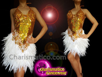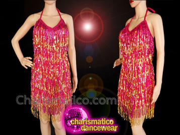 Samba is a Brazilian form of dance where everyone wears extravagant costume to look gorgeous. This fuchsia dress is the perfect pick for the occasion. It has a halter neck top with a necklace like structure made out of beads. The top has fuchsia beads and sequin and the skirt has fuchsia and black feathers.