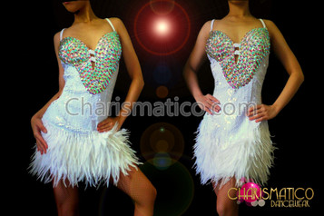 Cleavage enhancement is yours with this smoothly sequined green Latin dance dress.  Black highlights the bust line drawing the eye to the detailing there while the feathered skirt works wonders to create added curves. Make green your color of choice with this stunning dress.