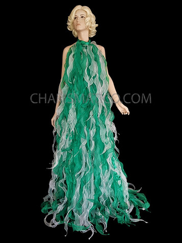 Green and white ruffled organza covers this high necked gown. This flattering gown shows off your lovely shoulders, arms, and back while adding ruffle extravagance to the main body section for an fabulous flowing look.  The green and white color motif makes this a great piece for St. Patrick's Day or even Christmas!  So whether your planning an outfit for a drag competition or if you are just looking for a standout piece at the next party, this will certainly make an impact on who ever sees you wearing it!