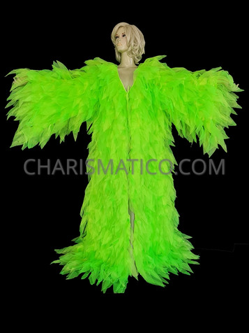 This green and neon green ruffle organza coat is sure to give you the extravagant jungle-theme look you are searching for. The cut of material in the boat will make it look full and extravagant. You definitely will standout in the crowd with this beautiful coat.